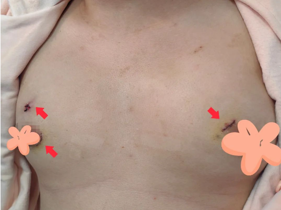 该手术分别于两侧乳晕及(或)胸前作1cm切口并建腔注入二氧化碳,完全在内镜下完成手术。适应症:单侧或双侧良性甲状腺良性病变、Ⅱ°肿大以下的甲亢需手术的患者、肿瘤最大径≤2cm的甲状腺乳头状癌(同时未侵犯周围器官、无广泛淋巴结转移,中央区转移的淋巴结无融合固定)、患者有强烈的美容需求。禁忌症:既往有颈部手术及放射史、甲状腺腺体Ⅲ°肿大、顾忌乳腺美观者等。