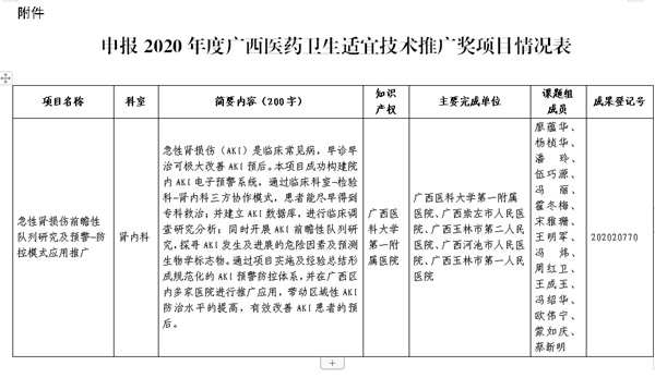 我院从2015年9月至今作为第四完成单位参与了由广西医科大学第一附属医院肾内科牵头的“急性肾损伤前瞻性队列研究及预警-防控模式应用推广”项目,蒙如庆同志作为项目第十四完成人参与项目研究工作并作出相应贡献,项目研究工作已经完成,拟共同申报广西医药卫生适宜技术推广奖。根据广西医药卫生适宜技术推广奖申报要求,现对申报项目的名称、项目简介、项目完成单位、主要完成人员等予以公示,公示期7天(2020年4月17日-4月23日)。