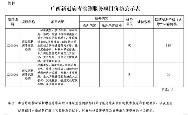 按照河池市医疗保障局《转发自治区医保局关于临时新增医疗服务项目进一步做好新冠肺炎疫情防控工作的紧急通知》,要求对于复工复产复学过程中自愿申请新冠病毒核酸检测的单位、个人及需要进行新冠病毒核酸检测,现将我院新冠病毒检测服务项目价格予以公示,公示时间:2020年4月21日-5月21日,如有异议,请以书面形式并署真是姓名和联系地址于2020年5月21日前邮寄或直接送达河池市人民医院财务科。邮政编码:547000(直接送达的以送达日期为准,邮寄的以邮戳为准);联系电话:0778-2278280。