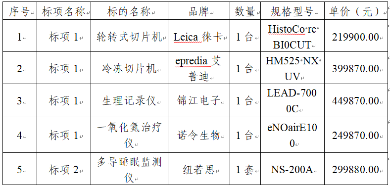根据医院2024年医疗设备采购计划,需要采购轮转式切片机1台、冷冻切片机1台、生理记录仪1台、一氧化氮治疗仪、多导睡眠检测仪各1套,鼻功能诊断系统(含嗅觉测试)1台,电子鼻咽喉内窥镜1根,甩头试验仪1台。根据政府采购管理要求完成项目采购公告及项目采购计划申报、审批后,医院委托国鼎和诚项目管理集团有限公司为项目采购代理公司,于2024年12月5日就河池市人民医院医疗设备采购-2项目在河池市公共资源交易中心采用公开招标的方式进行采购。现将成交结果公示如下: