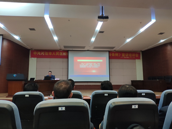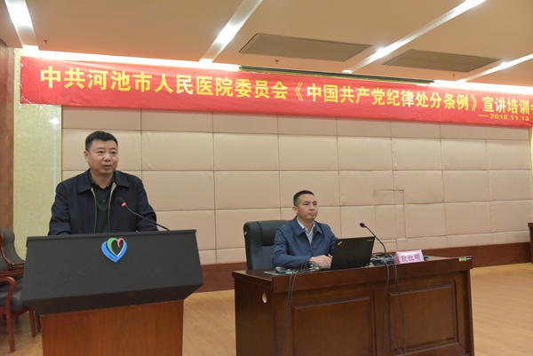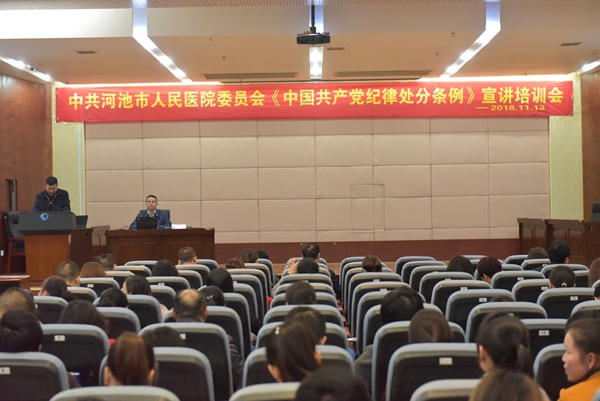 为贯彻落实新修订的《中国共产党纪律处分条例》,切实加强医院党员干部职工纪律教育,进一步提升全院党员干部廉洁自律意识和拒腐防变能力。2018年11月13日下午,我院在门诊综合楼23楼多功能会议厅召开新修订的《中国共产党纪律处分条例》宣讲培训会。医院领导班子成员、全院中层干部和在职党员以及行政职能科室人员参加了宣讲会。宣讲培训会由院纪委书记韦克波主持。