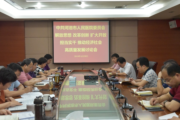 根据河池市委工作部署,4月29日,我院党委召开“解放思想 改革创新 扩大开放 担当实干,推动经济社会高质量发展”专题研讨会,深入学习贯彻全区省级领导和厅级主要负责同志专题研讨班精神及自治区党委书记、自治区人大常委会主任鹿心社在开班仪式上的讲话精神,准确把握新时代新形势下医改工作的新要求新任务,动员干部职工进一步解放思想、改革创新、扩大开放、担当实干,助推经济社会高质量发展。我院党委书记韦义甜主持会议并讲话,医院党委委员、领导班子成员、各党支部委员参加了会议。
