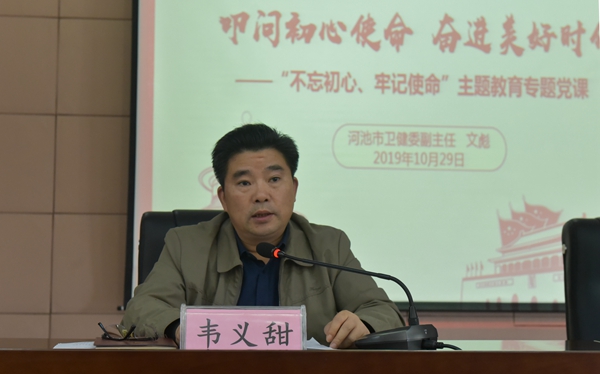 10月29日下午三点半,河池市卫健委副主任文彪莅临我院开展“不忘初心、牢记使命”主题教育专题党课。院领导班子、全体中层干部及全体党员约300人参加会议。