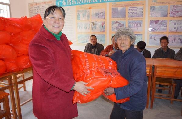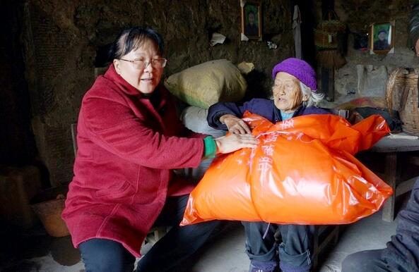 图为陆艳姣书记正在把棉被送到村五保户送到五保户手中