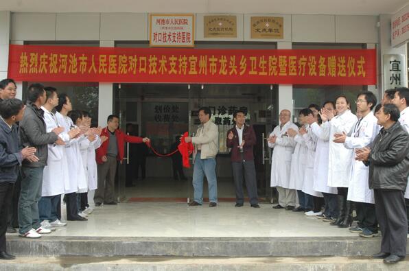 4月16日,市人民医院组织医疗专家一行12人,在梁涛副院长的带领下到宜州市龙头乡卫生院开展对口技术扶持活动并举行挂牌仪式,赠送了价值4万元的医疗设备。